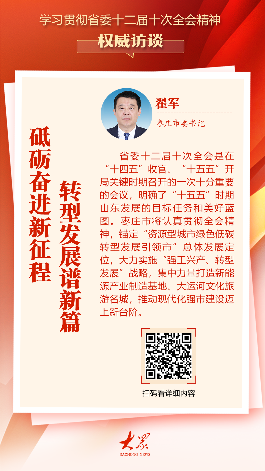 省委十二届十次全会是在“十四五”收官、“十五五”开局关键时期召开的一次十分重要的会议,明确了“十五五”时期山东发展的目标任务和美好蓝图。枣庄市将认真贯彻全会精神,锚定“资源型城市绿色低碳转型发展引领市”总体发展定位,大力实施“强工兴产、转型发展”战略,集中力量打造新能源产业制造基地、大运河文化旅游名城,推动现代化强市建设迈上新台阶。