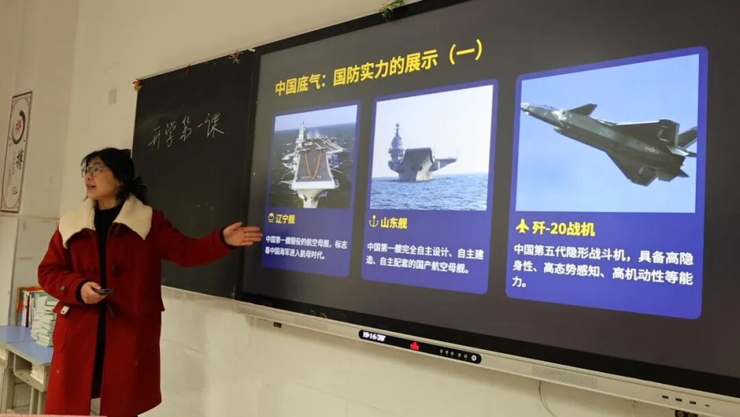 兴华学校则精心策划了一堂别开生面的“开学第一课”,将国防教育与前沿科技深度融合,引导学生从世界风云中读懂中国底气,在科技浪潮中立下报国之志。课堂上,大屏幕被一分为二。左侧是中东地区战火纷飞、断壁残垣的动荡景象,右侧则是神州大地车水马龙、岁月静好的安宁画面。强烈的视觉反差,让在座的每一位学生深受震撼。紧接着,辽宁舰、山东舰劈波斩浪,歼-20战机呼啸苍穹,东风导弹昂首待发,一段段展示我国国防硬实力的视频燃爆全场。