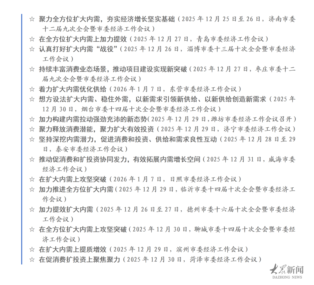 山东各市市委经济工作会议关于“扩大内需”的相关表述。(大众新闻)