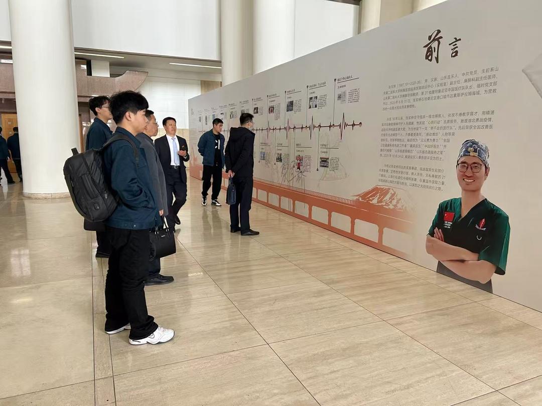 报告会开始前,许多观众驻足在“医心化桥 英雄无悔”——齐鲁时代楷模张军桥同志的21个瞬间事迹展前,认真阅读,缅怀英雄。