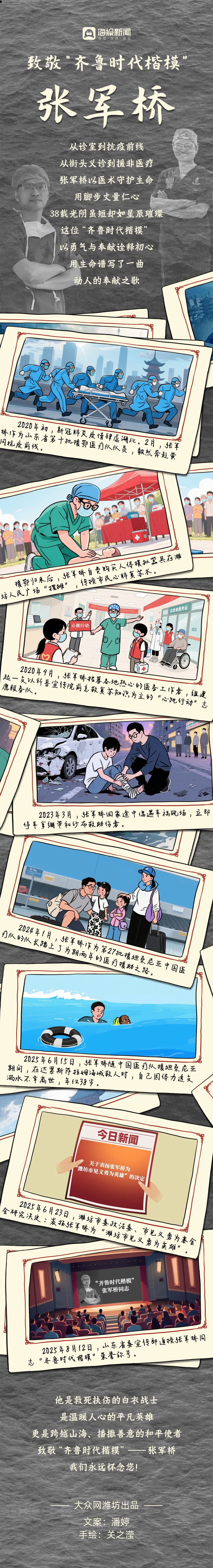 6月23日,张军桥被追授为“潍坊市见义勇为英雄”,7月被追授为“山东省道德模范”,8月12日,被追授为“齐鲁时代楷模”。这些荣誉,是对他厚重的人生最深刻的注解,正如他常说的:“我一辈子只做一件事,那就是当医生,救死扶伤。”